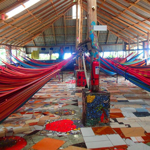 There are a mix of places to stay depending on what you’re looking for. I’ve stayed in simple, low-budget spots with outdoor showers and open spaces, and I’ve also spent time at places like Rocking J’s, where you can sleep in a hammock in a big open-air setup, or choose a tent.
